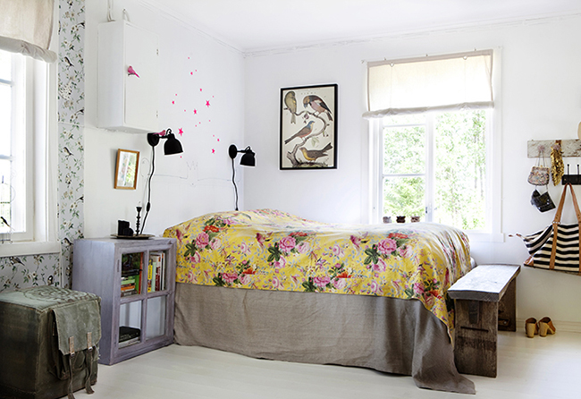 El dormitorio sigue la misma línea que el resto de la casa, muebles recuperados pintados de algún tono pastel en este caso gris con textiles arriesgados pero integrados a la perfección de estampados florales.