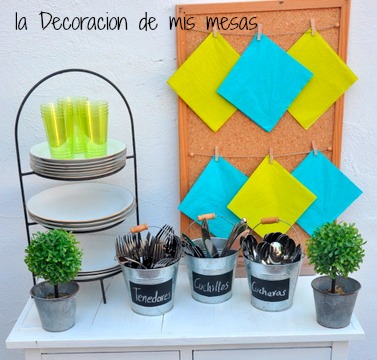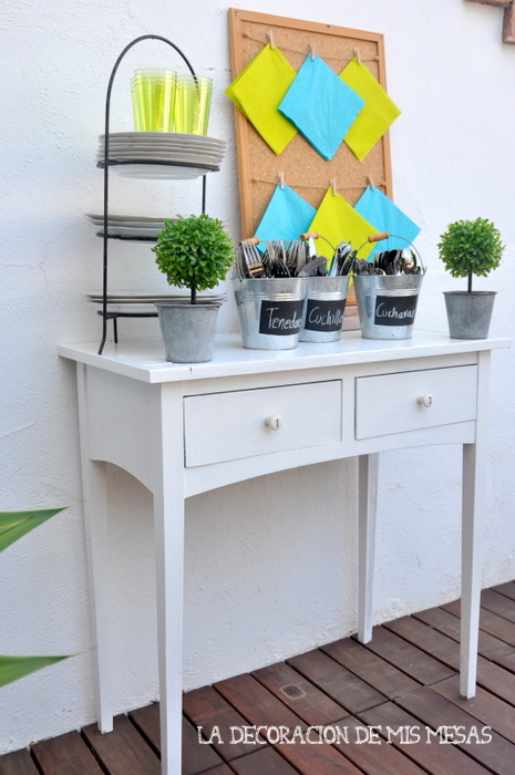 Esta mesa auxiliar que os muestro hoy, es un ejemplo muy sencillo pero muy vistoso de decoración de mesa para un buffet. El truco es organizar la vajilla, de manera que quede a distintas alturas y presentar los cubiertos separados por tipos.