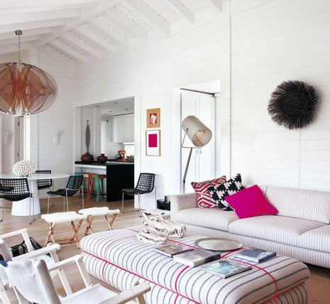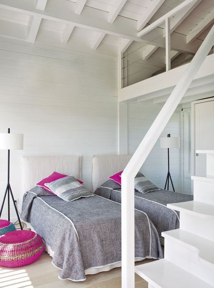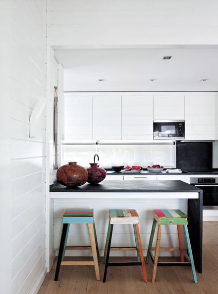 El exterior se traslada al interior, creando espacios muy amplios y luminosos con una decoración claramente nórdica, pero con un toque muy marinero. Ambientes continuados, salón - comedor - cocina como único espacio, cuyos colores predominantes en general son el blanco y la madera natural. Estos colores relajantes y neutros se ven contrastados con el brillo de otros más llamativos: Fucsias, azules, rojos y naranjas cobran protagonismo en textiles étnicos.