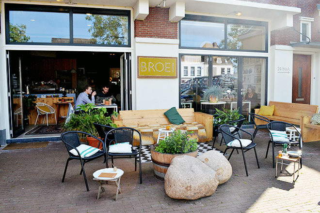 Sobre todo, me quedo con la entrada, la idea de tener toda la pared de pizarra, me parece perfecta para ir cambiando la decoración, poner anuncios y ofertas para los clientes.. además le da un punto muy divertido. Además, la terraza no pasa desapercibida, además de ser lo primero que vemos, junto con la fachada, me encantan los sofás echos con madera, son perfectos para el exterior. Quizá, si tengo que ponerme puntillosa, yo hubiera elegido unas mesas para la terraza un pelín más altas, porque al final estas tan bajitas, se hacen incómodas para coger y dejar la bebida.