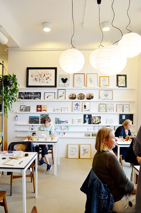 La pared del fondo, repleta de estanterías llenas de cuadros. y las amplias mesas del interior, invitan a charlar durante horas y porque no, a trabajar cómodamente en compañía de un café o un zumito refrescante.