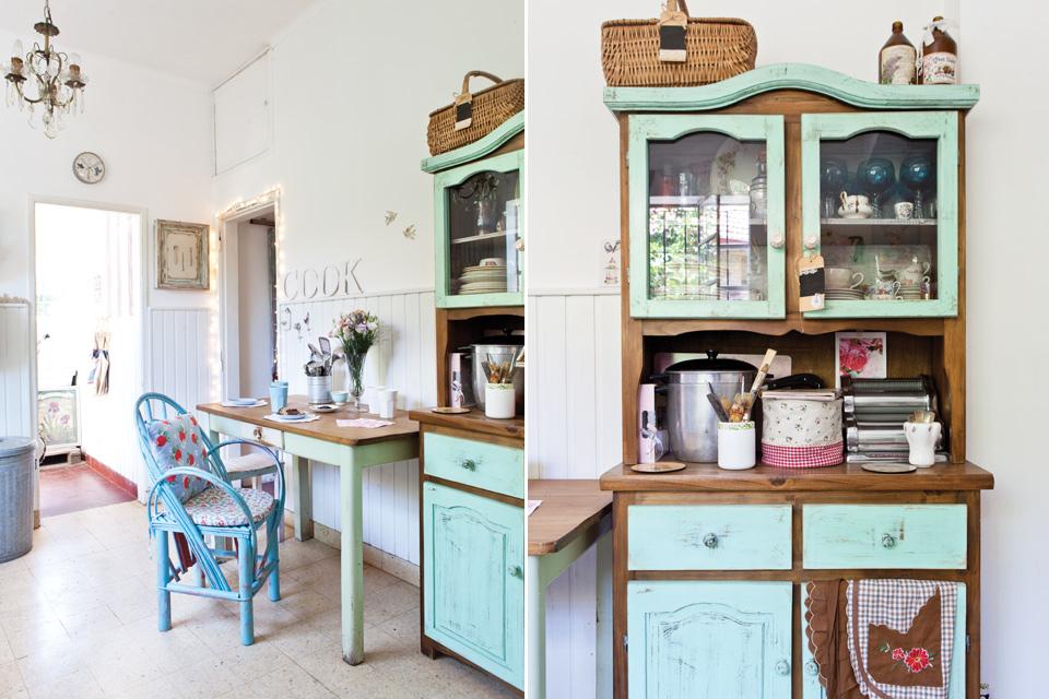 Me encanta como ha reinventado la alacena y la mesa con esa mezcla de madera y color mint tan de moda Para crear un ambiente fresco y veraniego y el atrevimiento de mezclarlo con esa silla en azul. Como yo digo quien no arriesga no gana.
