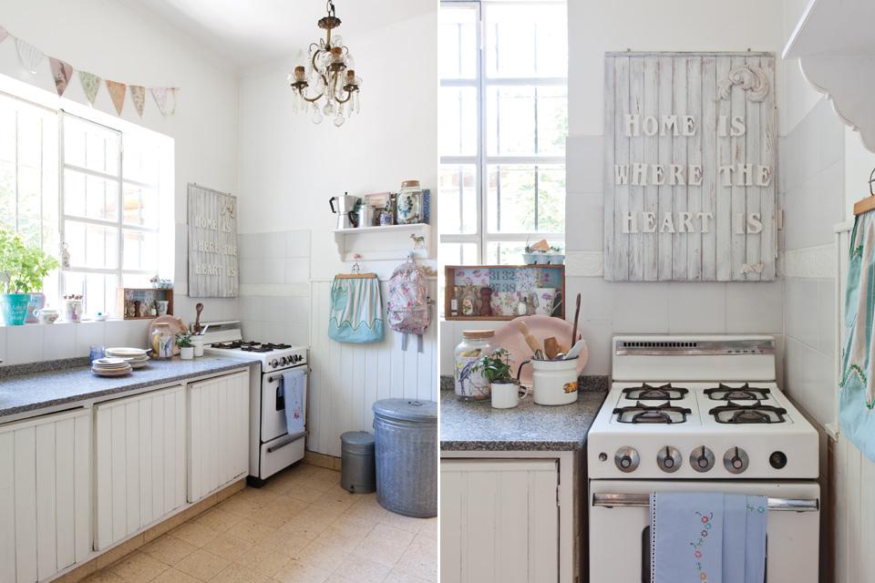 ¿Y la cocina con el lema? toda una declaración de intenciones y el toque francés de la lámpara de techo Una cocina luminosa donde el blanco es protagonista solo toques de color en tonos pastel como la colección de céramica vintage del estante rompe el monocrómo del blanco