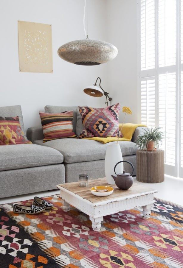 Hoy te traigo una casa llena de vida y de color, y es que la decoración bohemia cada día esta más en auge en nuestro país. Simplemente me encanta!, creo que para el verano es genial, ya que sus colores invitan a disfrutar todavía más de esa época del año. Cojines kilim, alfombras, y muchas piezas vintage, hacen de esta casa un fantástico hogar.