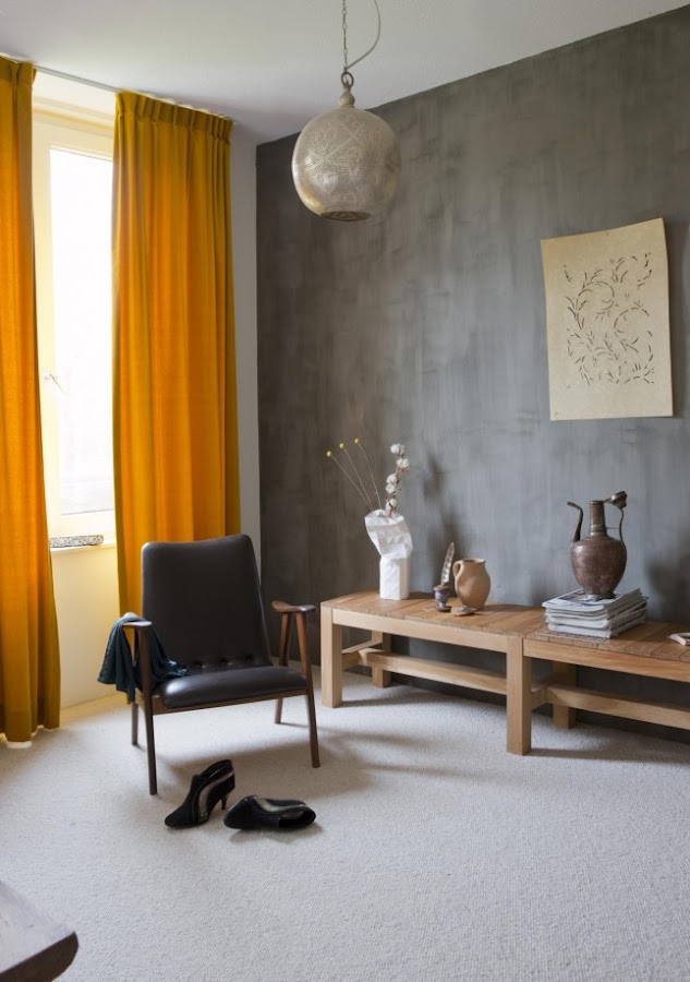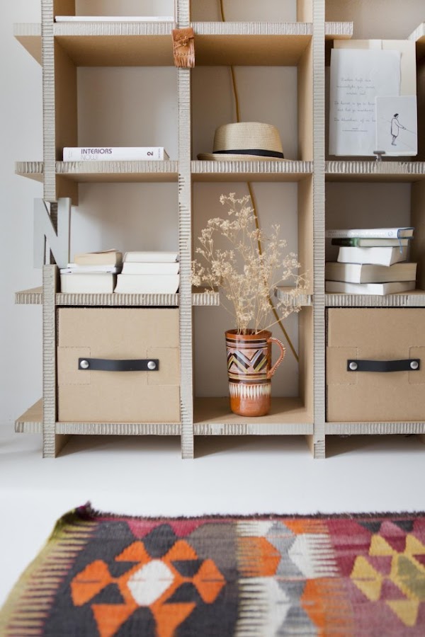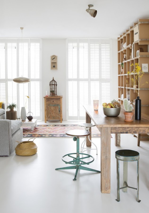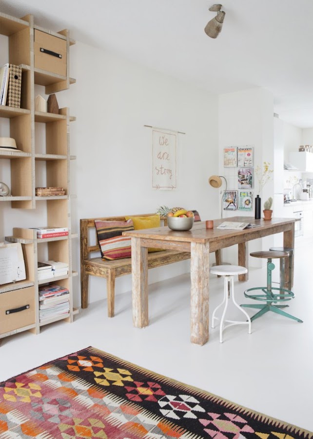 Lo que más me ha llamado la atención del salón ha sido esa enorme estantería de cartón. Sin duda alguna es carne de DIY y aunque no se donde encontraría cartón tan grueso, os tengo que confesar que voy a empezar a buscarlo. Me encanta porque al ser de un color tierra encaja perfectamente con esa gran mesa de salón de madera recuperada, pero esperad... ¿Que me decís de esa mesita de noche? A mi me ha enamorado y hace muchísimo que voy detrás de una, así que no descarto para nada a la larga hacerme con una de ellas.