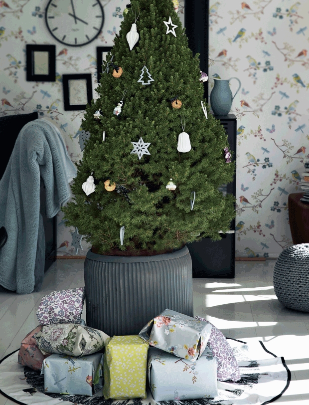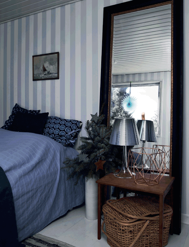 De nuevo vemos papel de pared, este clásico de rayas es un básico del que no te cansarás nunca, madera y pinceladas de cobre, clásico con toques actuales, vuelven a acertar de lleno.