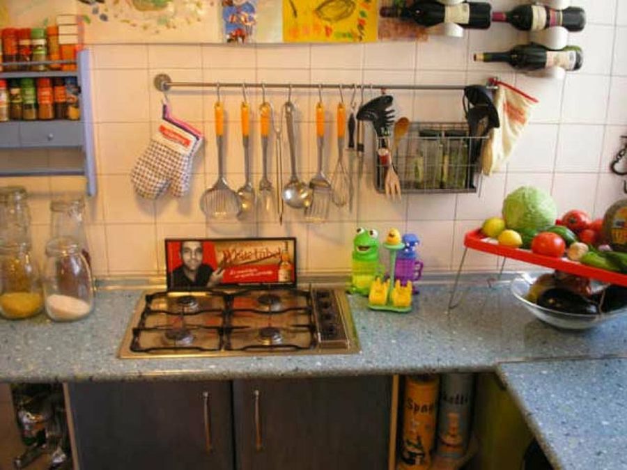 Las lámparas y la mayoría de los utensilios son de Ikea. Entre todos ellos destaca la cafetera ‘Nespresso Delongui’ y una balanza de herencia familiar que ahora sirve de frutero. La decoración de la estancia, según nos cuenta, se completa con "motivos publicitarios de ‘Coca Cola’, ‘Cruzcampo’ y ‘Kellog’s’ y el cuece huevos es un regalo de mi amiga del foro de decoración". No podemos pasar por alto el cuadro de la Rana Gustavo.