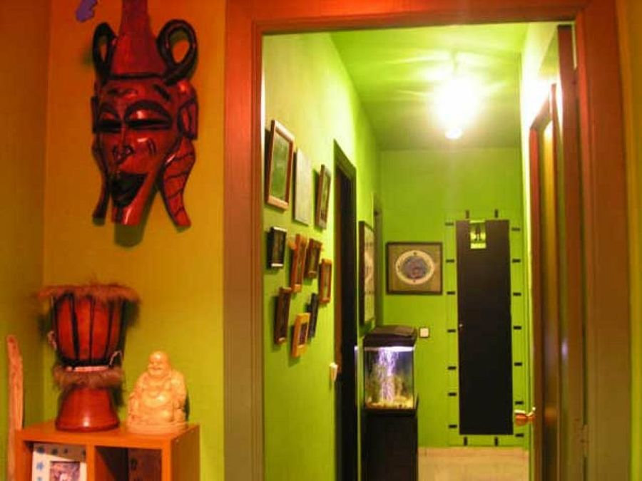 El recibidor y el pasillo en verde fuerte nos sorprenden gratamente, nada más cruzar la puerta. Para la decoración de esta parte de la casa se usaron muebles de otras estancias que fueron reciclados, como por ejemplo, unos cubos de melanina que ahora están pensados para que los niños se descalcen nada más llegar.