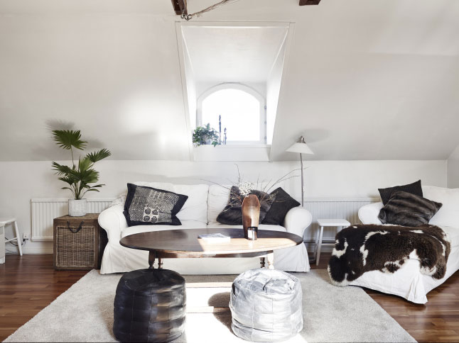Me encantan los pequeños detalles que tiene esta casa, la hamaca que hay colgando en las bigas de madera, la pequeña ventana encima del sofá, lo pequeña que es la habitación y lo grande que parece.... y lo último