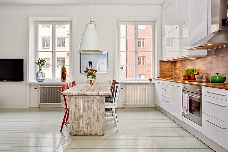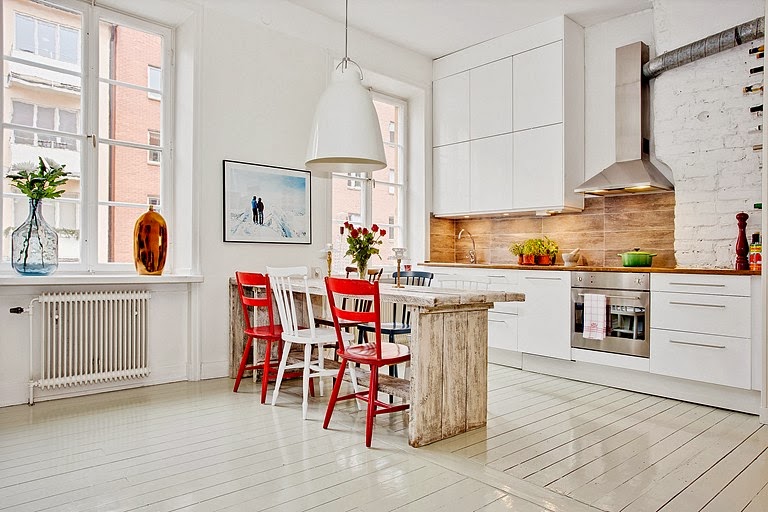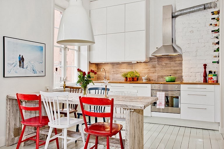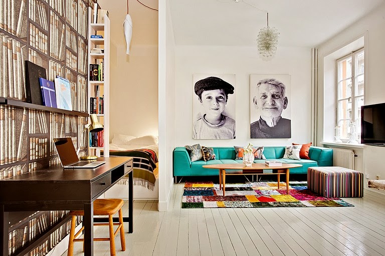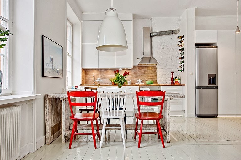 Que tu casa refleje tu personalidad es algo importantísimo para sentirte cómodo en ella, y eso es algo que saben muy bien los dueños de esta casa. La zona de estar presidida por dos grandes fotos de abuelo y nieto sobre un colorido conjunto de sofá, cojines, puf y alfombra, es espectacular. Además reconozco que la zona de comedor con muebles reciclado me tiene enamorada, la mesa realizada con viejos tablones de madera y las sillas restauradas con una mano de lija y dos de pinturas son realmente un rincón maravilloso. Una casa absolutamente única.