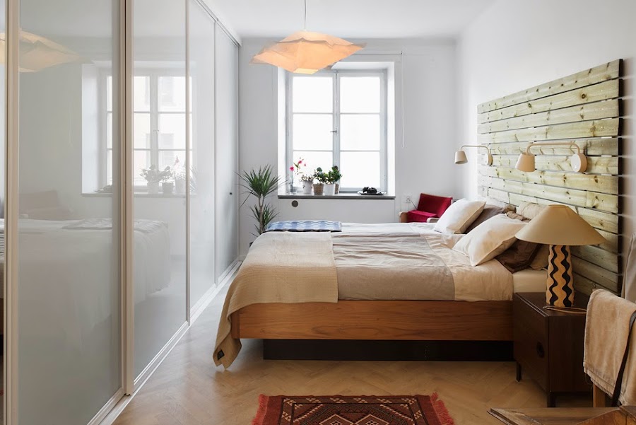 ¡una gran idea para habitaciones estrechas............!construir un cabecero con lamas de madera o restos de palets !