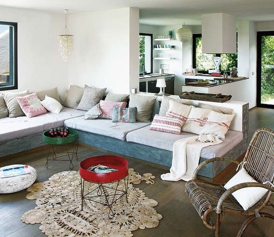 Suelos de madera de roble poblados de alfombras artesanales de fibras naturales, muebles de diferentes épocas y procedencia, tanto nuevos como vintage de estilo distintos de aspecto rústico o boho ,mobiliario recuperado y sin olvidar los detalles decorativos y la calidez de los texrtiles en forma de mullidos cojines que invitan al relax.