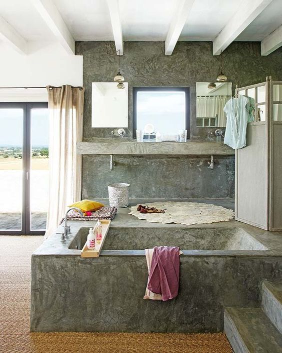 La paleta cromática se ha limitado al blanco y el gris con algunos toques de color.El cemento pulido es el material preeminente en esta construción sirviendo como mobiliario en diferentes estancias. como el banco en forma de U del salón a modo de sofá corrido o en el baño del dormitorio principal ideado como una suite y compuesto por zona de descanso,vestidor y baño.