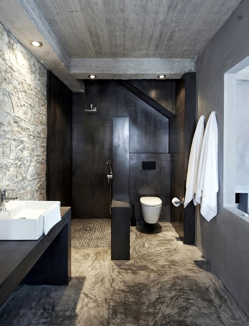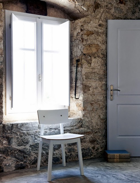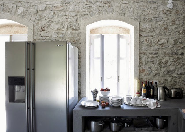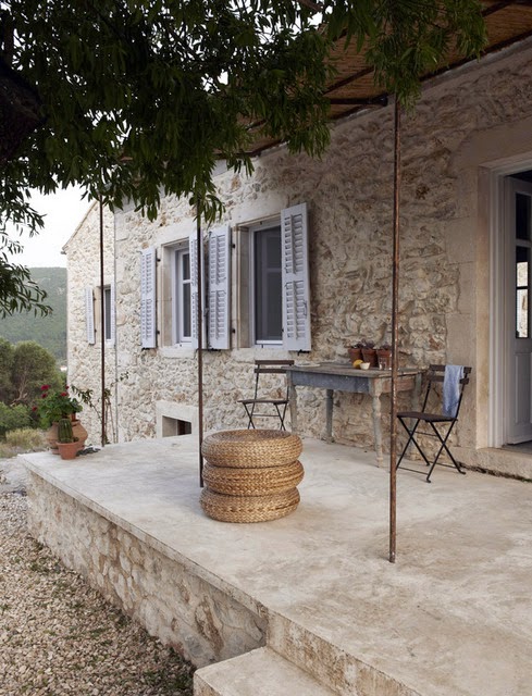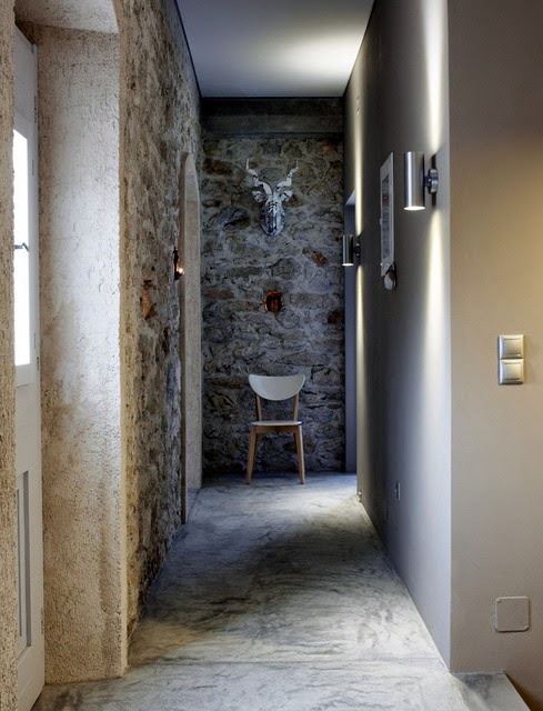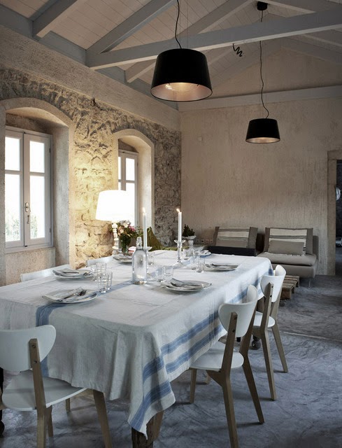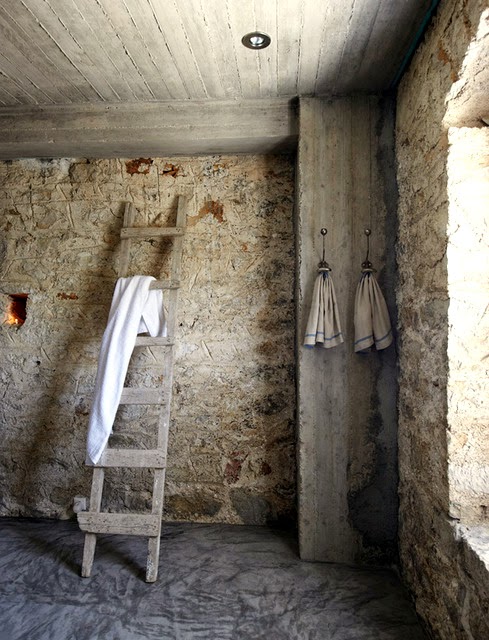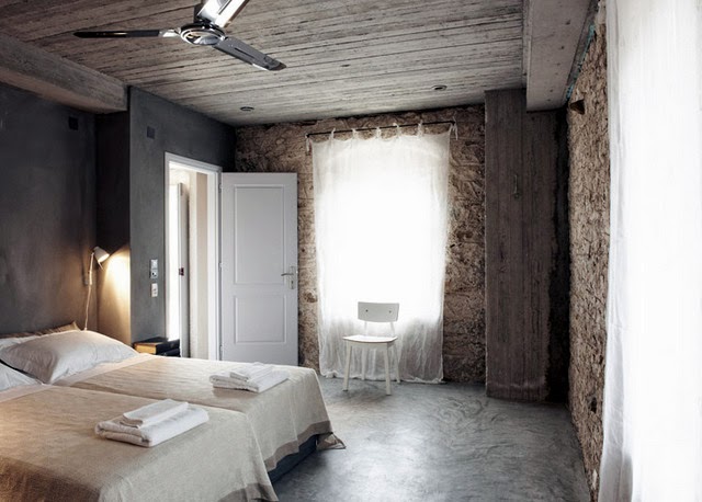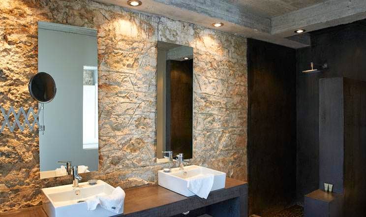 Me encanta las paredes son de piedra y el suelo esta hecho con microcemento, los techos de madera blanca, la han decoradora con un gusto exquisito, sin muchas pretensiones jugando con tonos claros y la iluminación del entorno, es un lugar casi celestial...