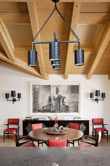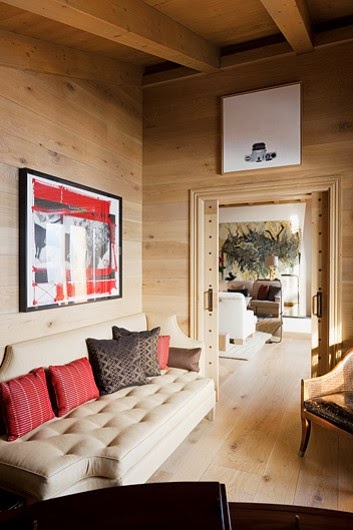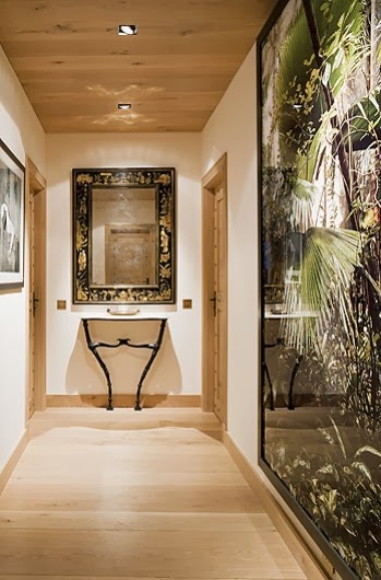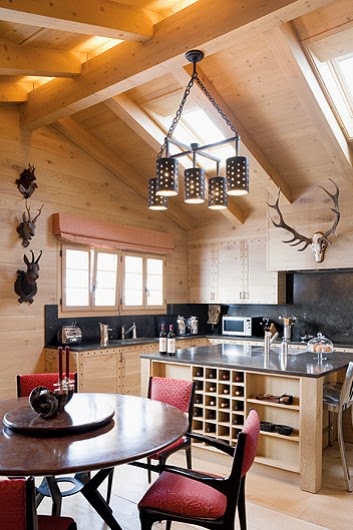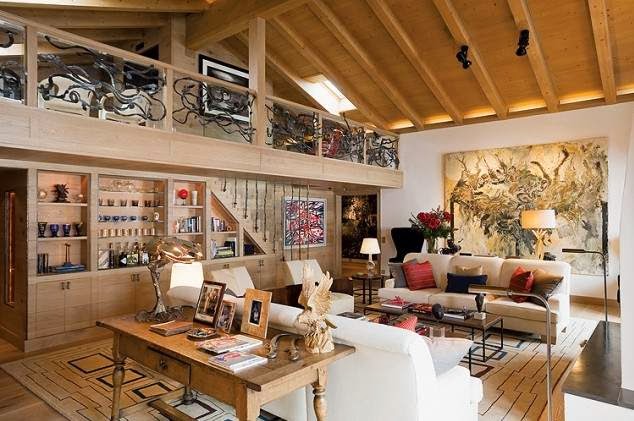 La madera es la auténtica protagonista de la casa, revisitiendo suelos, techos y paredes, imprimiendo calidez y confort. Arte contemporáneo y trofeos de animales disecados son una constante, junto a magníficas esculturas. Pero lo más llamativo es el techo abuhardillado con vigas de madera y la fantástica visión que se tiene desde el salón, del hall del piso superior bordeado por una barandilla de hierro forjado..