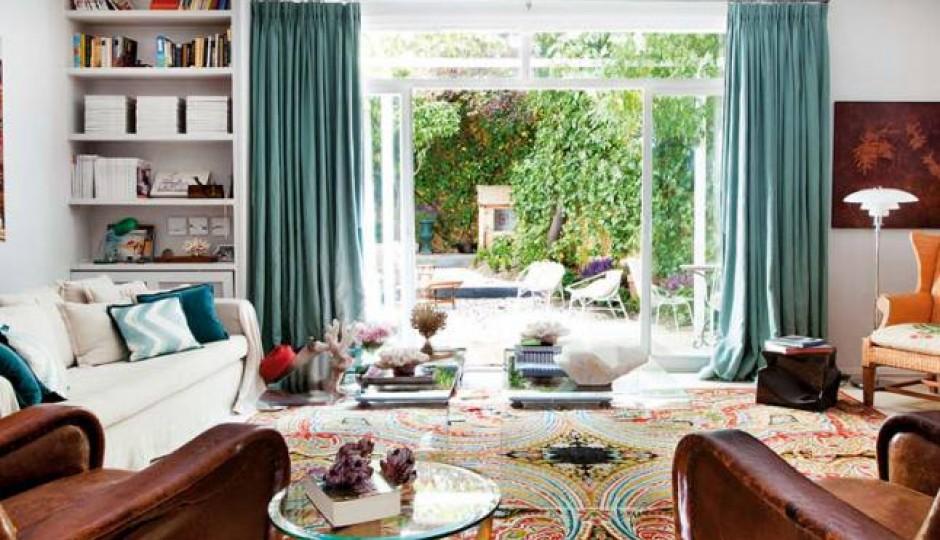 Los espacios se distribuyen alrededor de este entorno verde que es el jardín interior abierto a él, es el protagonista de la vivienda. La decoración está salpicada de muebles de diferentes estilos y épocas de distintas procedencias como la espectacular alfombra del comedor traida de la India.textiles de estilo étnico ,materiales como el meacrilato, la madera y el hierro conviven en una imperfecta aroinía que podra gustar más o menos pero que sin duda tienen una gran personalidad.