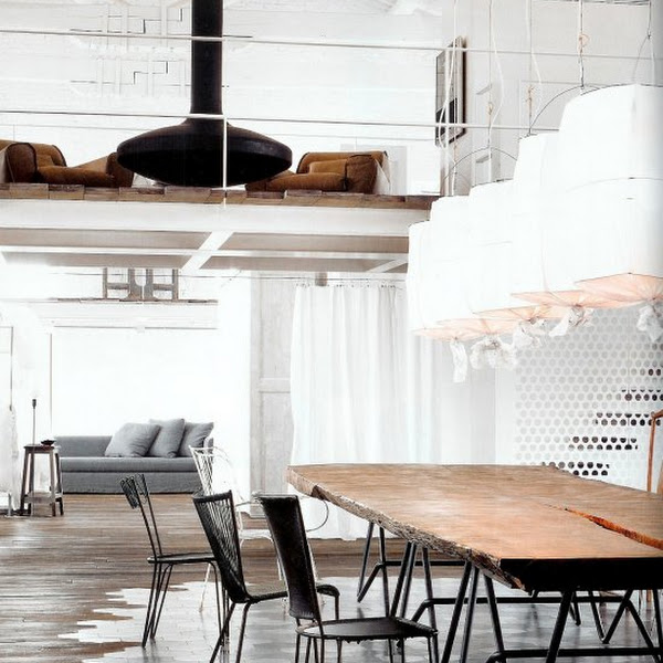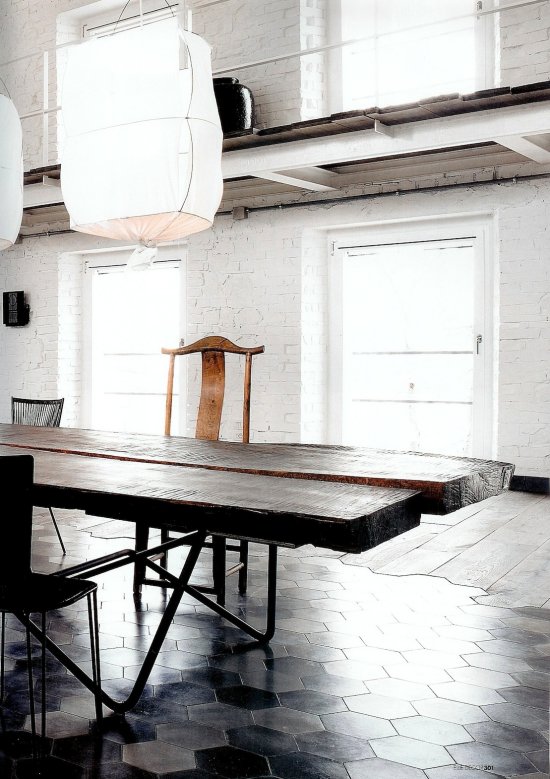 Las preciosas lámparas de tela que cuelgan sobre la enorme mesa del comedor, el suelo de baldosa hidráulica formando motivos geométricos y en tonos muy industriales, sillas de diferentes acabados y tamaños.