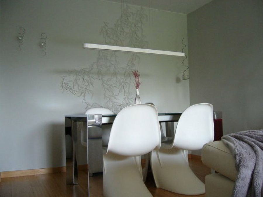El salón está dominado por los tonos grises con toques de rojo. Además del gran sofá de piel y una butaca a juego destaca la zona del comedor. Las sillas Pantón siempre son un acierto en este tipo de decoración, al igual que el minimalismo de la lámpara. Atención al mural en relieve de una de las paredes.