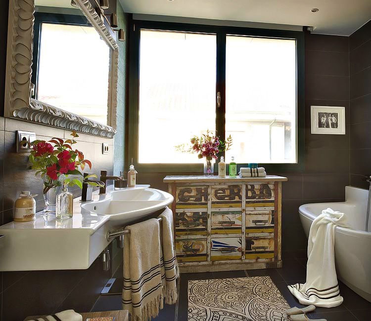 En el baño, sofisticado, el lavabo y la bañera son de grandes dimensiones, pero si hay algo que llama poderosamente la atención el la original cómoda situada bajo la ventana.
