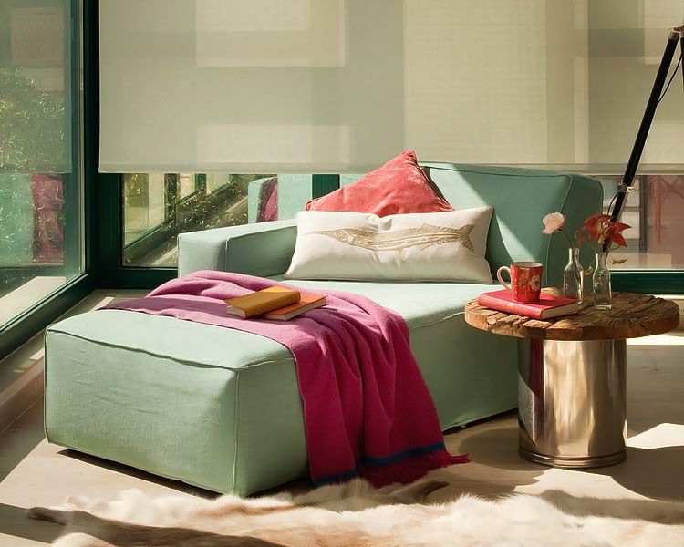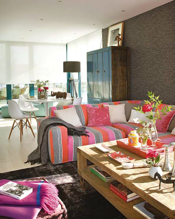 La decoración del salón-comedor apuesta por la combinación de mobiliario de estilos diferentes y el contraste de colores y texturas. Junto al comedor se creó un rincón de lectura y relax, con una chaise longue que entona con el resto del diseño.