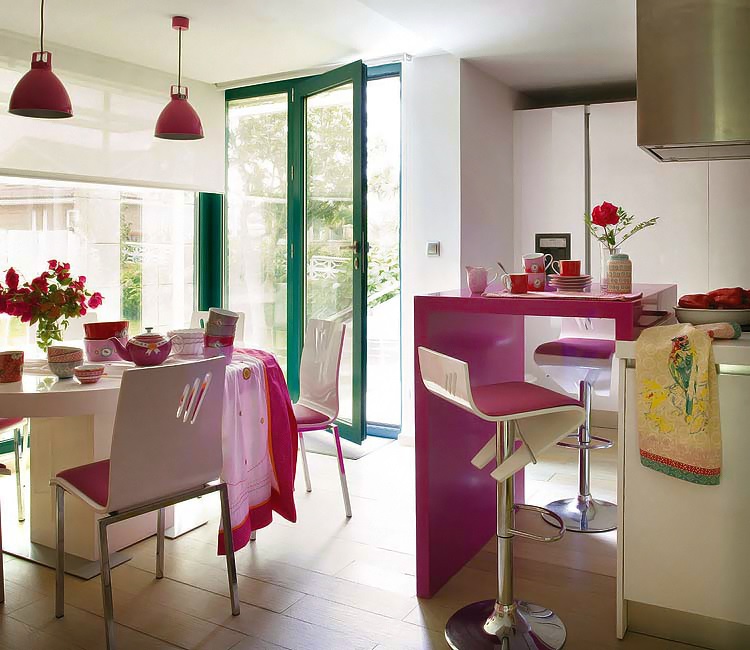 En la cocina, se reservó el espacio más luminoso para ubicar el comedor de diario y para optimizar el espacio en la cocina, se proyectó una península que se prolonga en una barra para desayunos. Con un papel pintado de rayas se delimita visualmente el office, y las paredes ganan protagonismo, además un papel con lunares y vibrante cromatismo focaliza la atención en el frontal del área de trabajo.