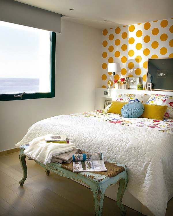Una dosis extra de vitalidad se siente en el dormitorio gracias al papel de lunares en un tono amarillo mostaza.