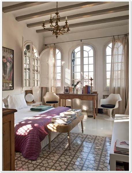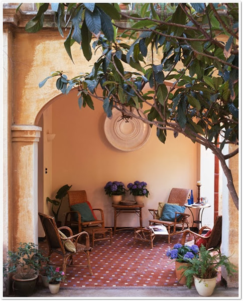 Lámparas de todos los estilos que decoran los distintos espacios de la casa, ventanas de arco en el dormitorio y un suelo hidráulico que me vuelve loca. ¿Y que me decís del exterior?. Un rincón donde leer, descansar y tomar un café con los amigos. Y a lo que no he podido resistirme es a la maravillosa piscina, que aunque ahora dé un poco de frío mirarla, ya me gustaría a mi disfrutarla....