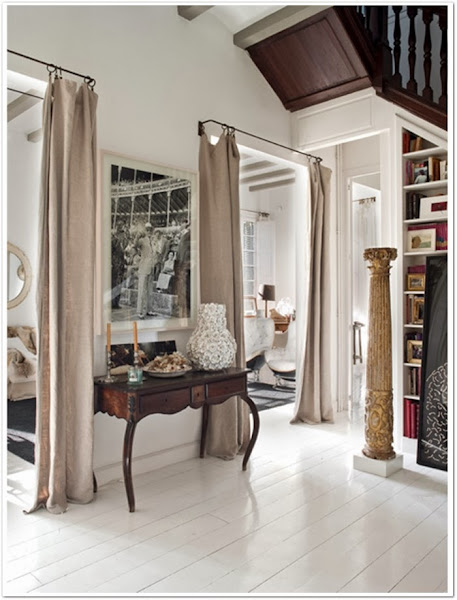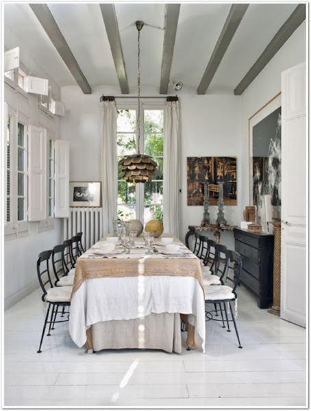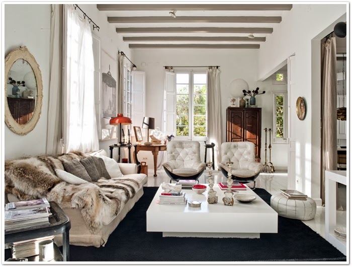 Cuando vi las fotos de esta casa pensé en la casa perfecta. Luego la perfección puedes ser o no de nuestro gusto, pero resultó que no solo el interior me fascina, sino que además el exterior es realmente precioso, por lo menos para mi. ¡Empecemos por el salón! Fijaos en las vigas del techo, en el blanco combinado con el negro, el beige y los toques de color. El orden, la simetría, la cantidad de luz natural que invade el espacio.... Muebles clásicos y modernos junto a objetos de lo más actuales, conviven en perfecta armonía hasta conseguir una casa con mucho carácter.