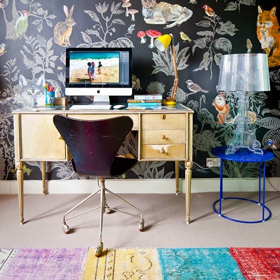 Primero que nada lo tengo que decir!!! Por fin una escapada de las largas y no de un fin de semana!!! Siiii!! Me voy dos semanitas a Eslovenia! Ya les contaré mi pequeña aventura por esas tierras en forma de alguna foto inspiradora!! Y ahora a lo que vamos!! antes de irme quería compartir algo que fuese atrevido, que no fuese una casa que cumpliera estrictamente con un estilo concreto y.......voilà!...... la encontré! Menudos rincones tan, tan originales, admiro a la gente que se atreve decorando, que confía en su propia visión global de las cosas y termina creando su propio eclecticismo! me parece encantador!! Hay dos rincones que me han enamorado, uno en el salón (foto superior) y el otro es el estudio!!! Pasen y vean!!!