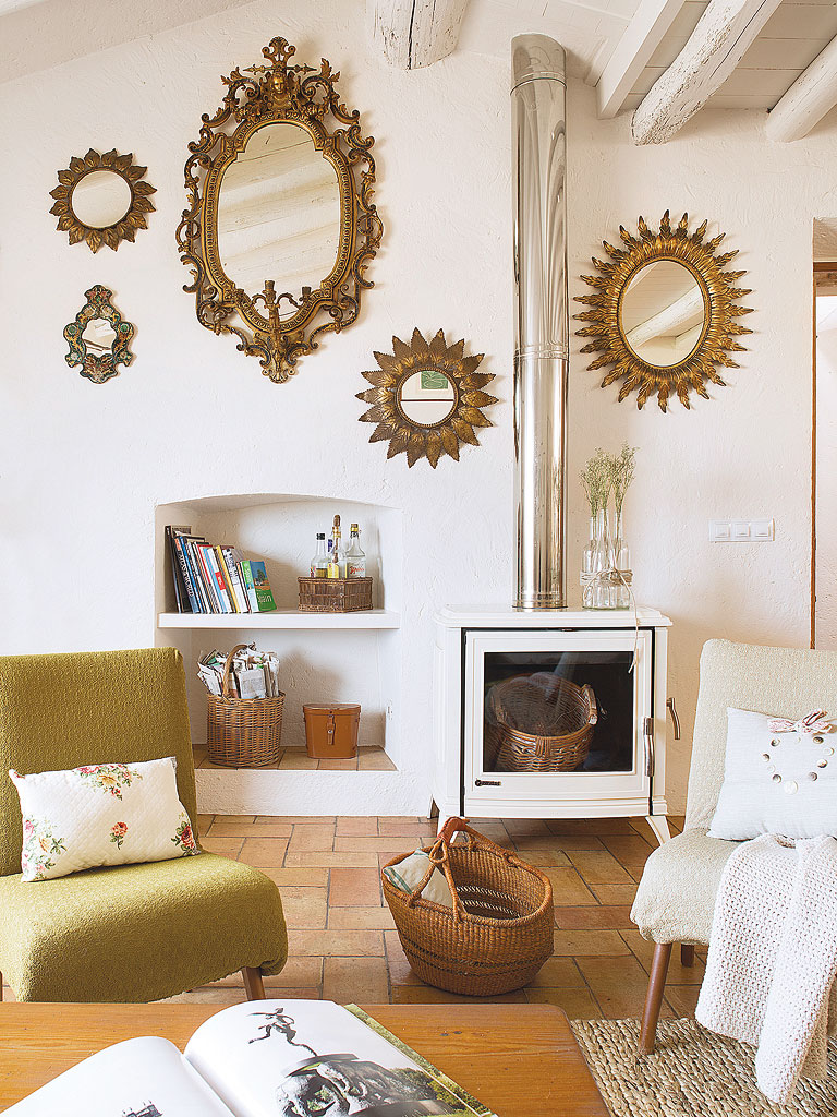 Esta casa se caracteriza por sus espacios amplios y abiertos al exterior con sus peredes de textura y color blanco a juego con sus antiguas vigas vistas. La decoración está compuesta por muebles antiguos comprados en el Market Golborne de Londres y Mercantic de San Cugat del Vallés y aderezada con complementos vintage,algunas piezas son de herencia familiar como los espejos que decoran una de las paredes del salón.
