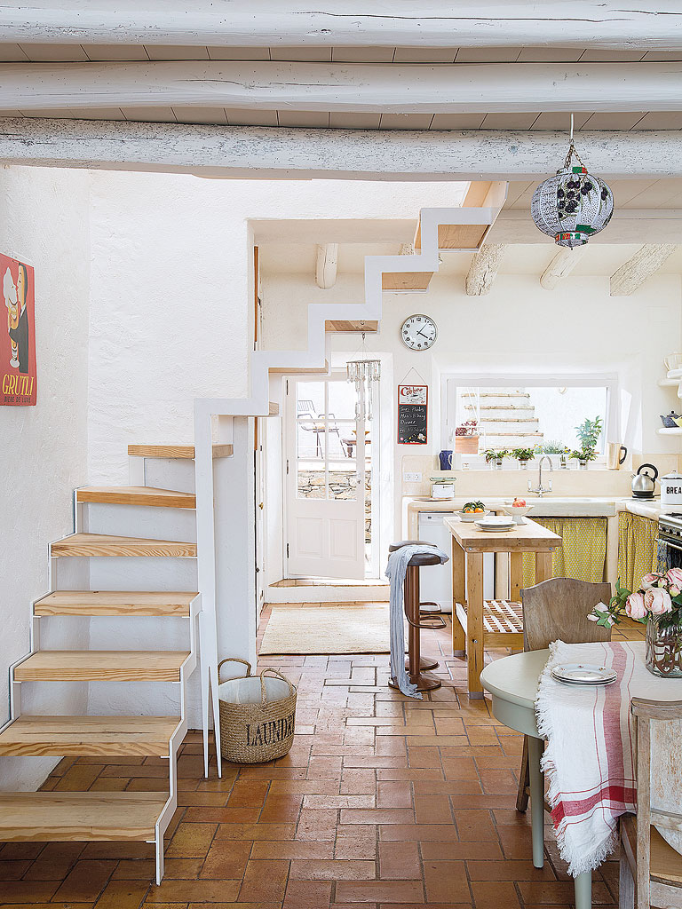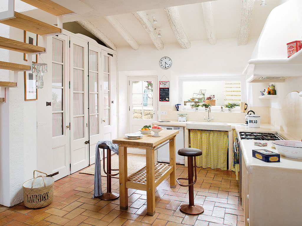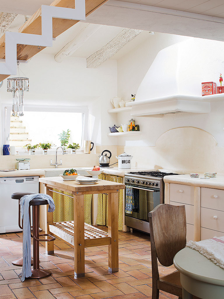 La cocina siguiendo con el estilo rústico es de obra ,hasta la encimera, un recurso muy ingenioso y que abarata costes. Es abierta al salón comedor.Sencilla y fresca, a mi me parece perfecta ¿tú que opinas?