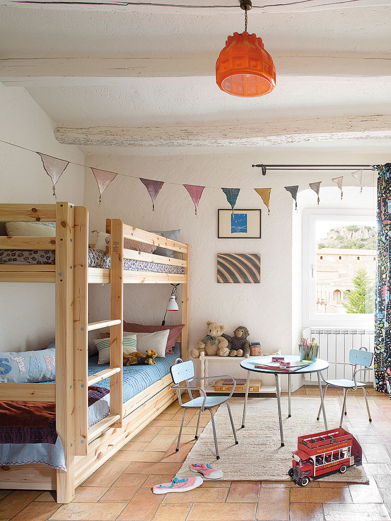 El dormitorio infantil con su mobiliario retro recuerda a las piezas escolares......¿No me digas que no es una cucada el conjunto de sillitas y mesa de fórmica?.