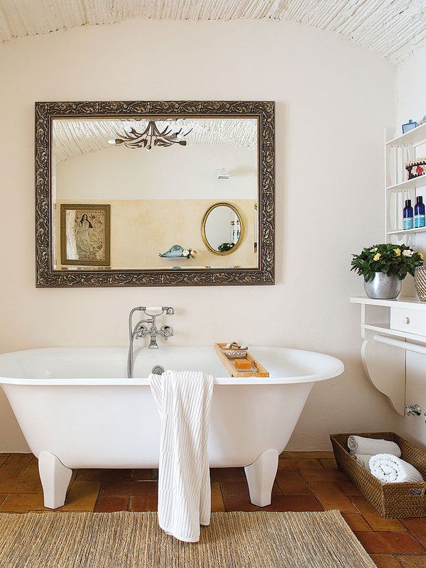 El baño sin aderezos en lo que a obra se refiere tiene en cambio mucha personalidad las piezas esmaltadas( la jarra y el cubo de los antiguos baños). Si tienes alguna pieza ,en el enlace te dejo unas ideas para sacarle partido..... Y la ménsula a modo de pequeña mesita es preciosa ha sido recuperada por la dueña igual que la bañera, el espejo y la vitrina del baño. Ya sabes hay que dar una segunda oportunidad a esos muebles que creemos desfasados o viejos.