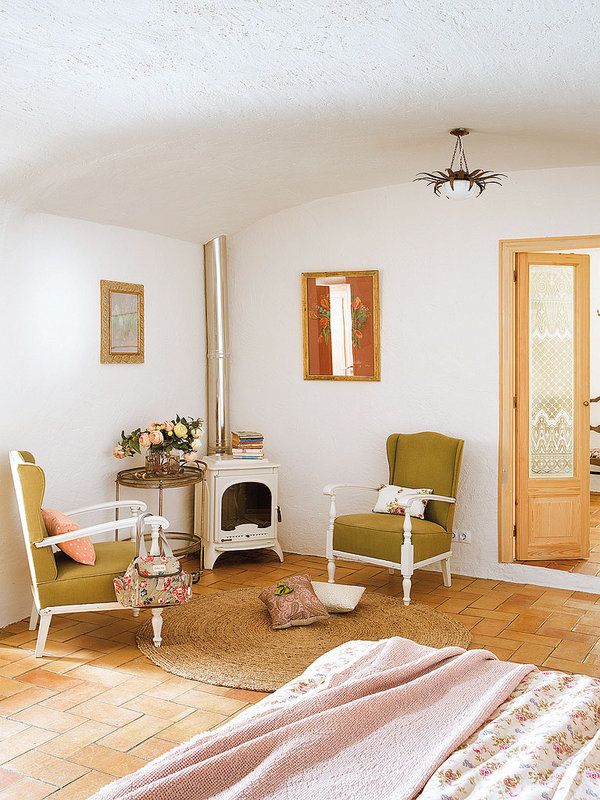 El dormitorio con un aire femenino y un toque romántico tiene un rinconcito ideal para las noches de invierno con esa estufa y sus silloncitos vintage.