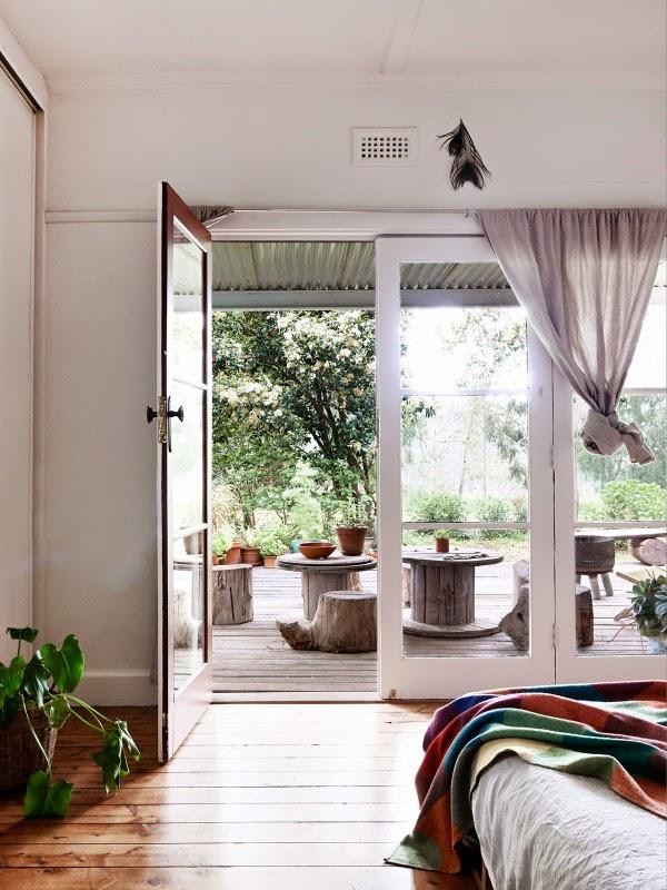 El dormitorio da a un jardin donde bobinas de cable y troncos de madera se convierten en mesas y asientos.Reciclaje en estado puro.