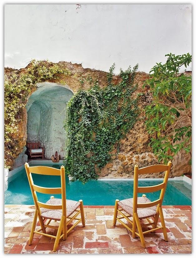 Punto y a parte merece el patio,seña de identidad de una casa sevillana que se precie,con la alberca que se introduce en una cueva natural que hay en él.Me ha parecido un lugar mágico donde refrescarse del tradicional calor sevillano y pasar las largas hora de la tarde estival resguardado bajo sus columnas con un buen zumo de las exquisitas naranjas de la zona o porqué no con un vinito dulce de naraja ( que se produce en la zona)una delicia te lo digo yo que lo he probado !!.....y un libro entre las manos.No parece mal plan!.