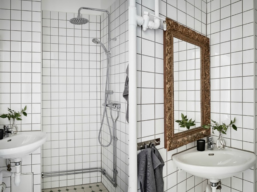 Suficiente para el tamaño de la vivienda, con todos los aparatos necesarios, eso si. Destaca el gran espejo sobre el lavabo, en color dorado, como contraste con el azulejo blanco. Minimalista, con un toque especial.