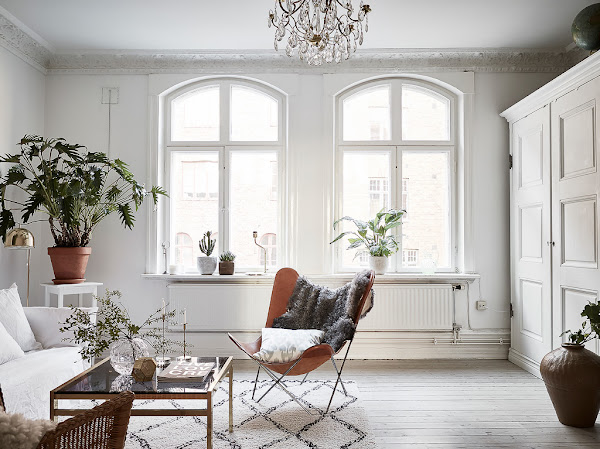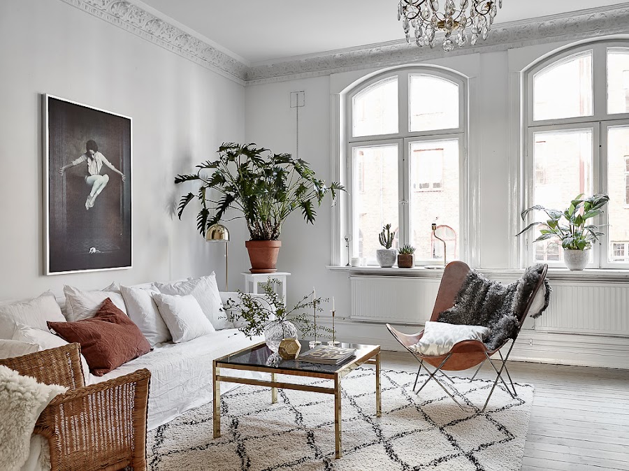 Un sofá y un par de sillas son suficientes para recibir invitados. Los grandes ventanales simétricos dejan pasar toda la luz que necesita.
