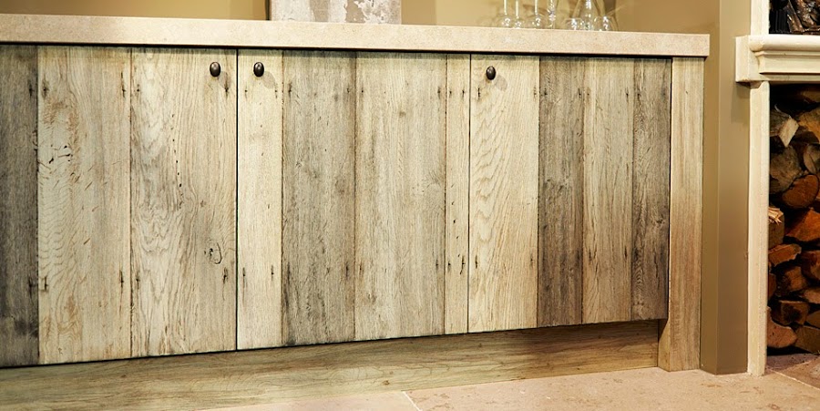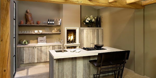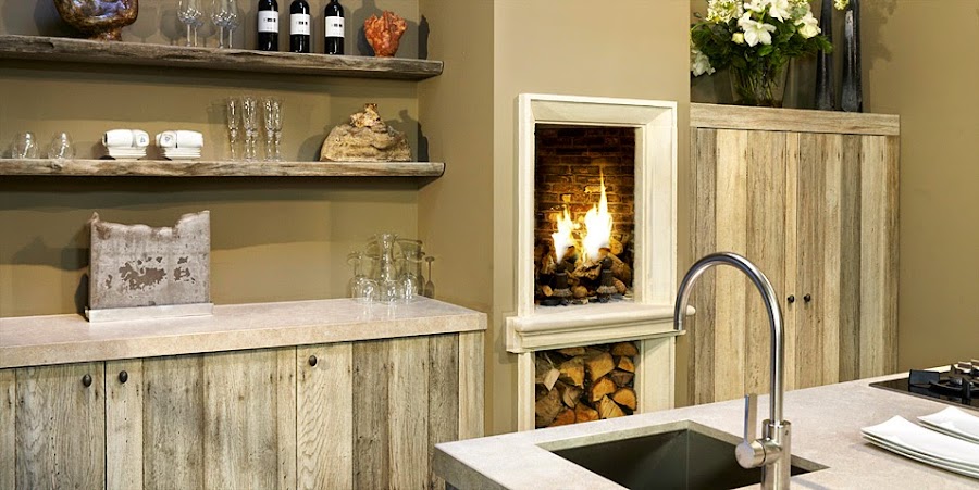 A pesar del aspecto rústico por sus acabados de madera maciza de roble, el diseño de ésta cocina con solera es moderno y lineal, donde la chimenea de leña, delata el clima predominante en la zona de los Países Bajos donde está ubicada la vivienda.