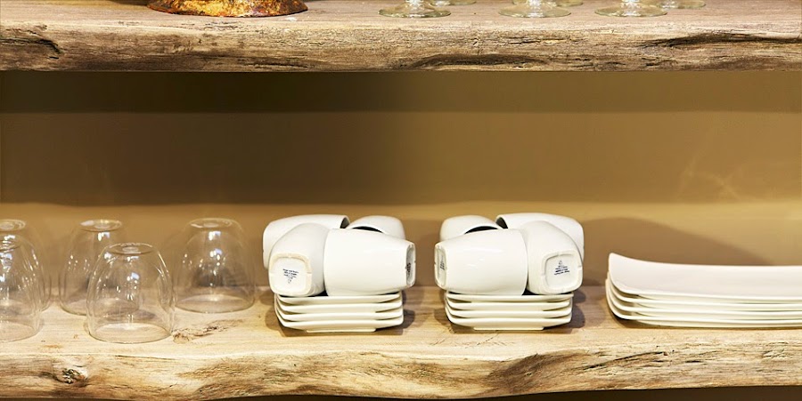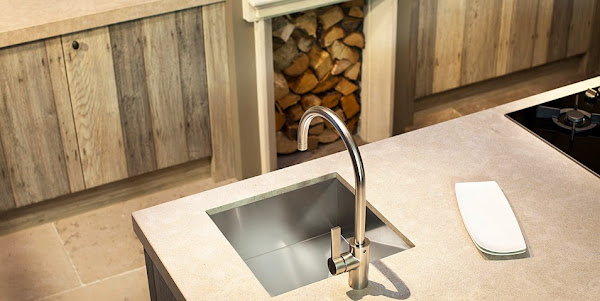Se trata de una pequeña y acogedora cocina compuesta por una isla con fregadero bajo encimera y placa de cocción, que contiene también una barra para comidas rápidas. Detrás, un cómodo espacio de trabajo y almacenamiento, mientras que en la parte superior deja, como detalle, un par de estantes de madera natural, que además de decorativos, pueden ser muy útiles. El cuarzo de la superficie de trabajo, refuerza las características actuales de un diseño atractivo que juega con el contraste de sus materiales. Es de la firma holandesa Tinello.