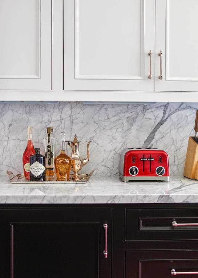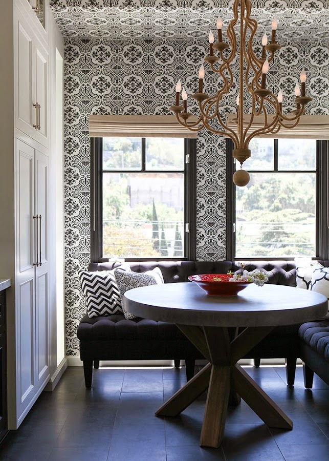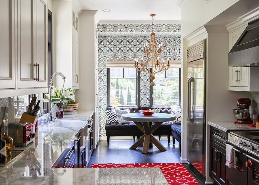 Cuando vi esta cocina lo primero que pensé fue ¡¡¡menudo papel y menuda lámpara presidiendo toda la cocina!!! Es espectacular el rincón que han creado con un papel de pared que aporta relieve y la majestuosa lámpara que termina por llevarse todas las miradas!!!! Suavizan la frialdad de la gran encimera de mármol a la vez que aporta el máximo de sofisticación, glamour o como quieran llamarlo!!! no creen?. Rojo, negro y blanco!! todo está milimétricamente pensado, nada está por casualidad!! las fotos de la pared del rincón de desayuno tienen la misma gama de colores, ahhh y la mesa de madera robusta y la alfombra aportando la calidez!! La creadora de este diseño es Jennifer Dyer.