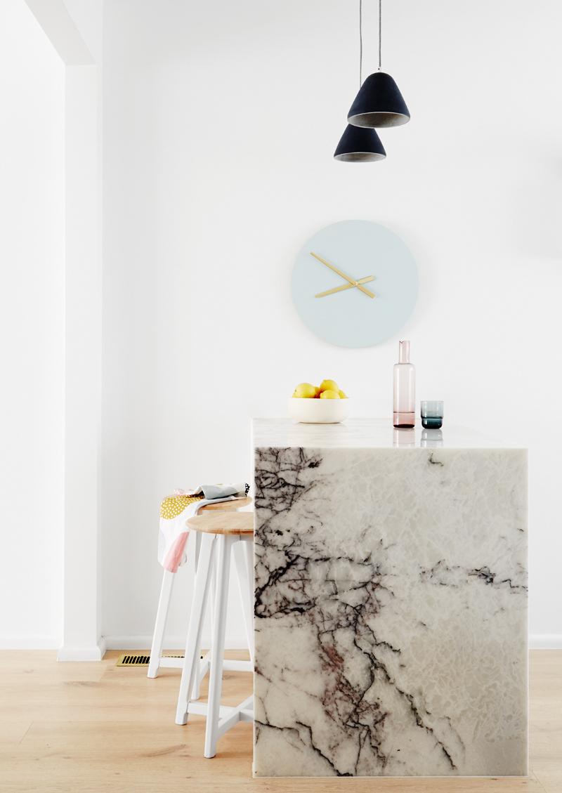 Maravilloso el revestimiento del salpicadero con las teselas en forma hexagonal. Y maravillosa también la barra de desayunos de mármol. ¡Además del privilegio de tener todo el frente de la cocina abierto con la ventana, claro!