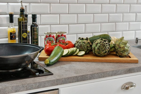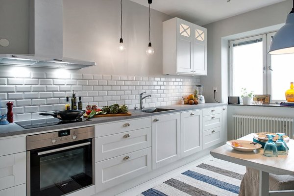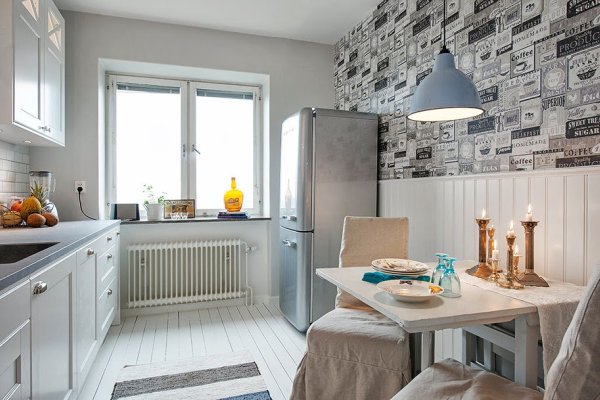 Los diseños nórdicos siempre me han gustado y esta cocina es la típica cocina nórdica, con mucha luz y espacio. El detalle del papel pintado en la zona de office queda perfecto combinado con la blancura de las lamas de madera a media altura. El mobiliario es sencillo y funcional, y se ha optado por el almacenaje en los muebles bajos, dejando la pared prácticamente desnuda, lo cual hace que parezca más grande. La alfombra estampada aporta el colorido que le falta y hace juego con la lámpara del office. Una cocina acogedora, ordenada y cálida,como son las cocinas nórdicas que tienen un encanto especial y una luz impresionante.