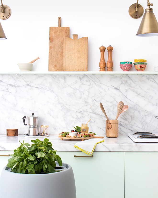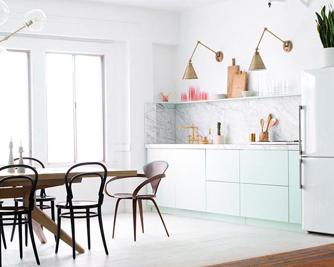 Verde pastel, blanco, mármol y dorado son los colores y texturas que configuran esta cocina y me parece una alternativa ideal para la tendencia tan en auge en decoración en esta temporada como es la fuerte presencia del verde. Como decía en un post anterior que compartí también con una cocina verde como color, no soy muy fan de colores en los muebles pero no dejo de reconocer que con tonalidades pasteles quedan bastante atractivas y elegantes.