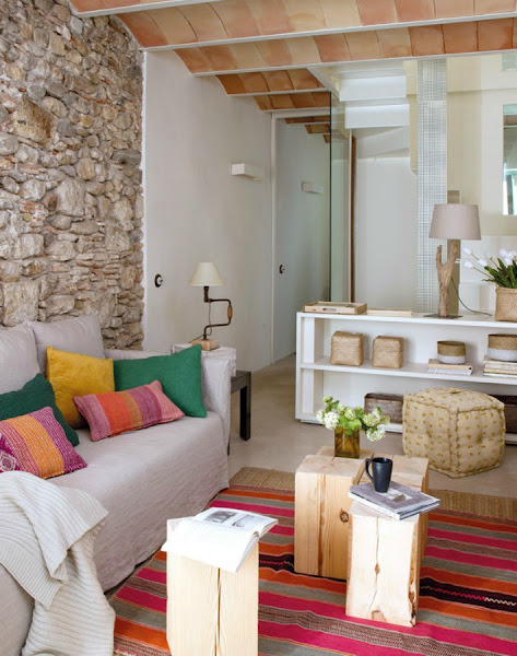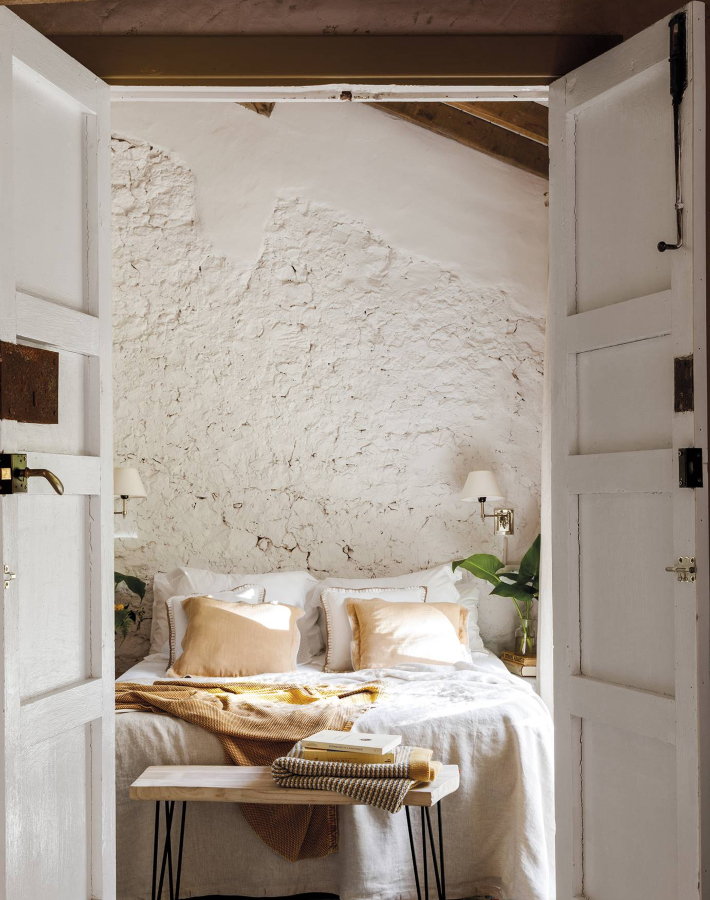 Toda la base de la casa, como las paredes de piedra, es original; algunas ni se tocaron ni se pintaron, de hecho se dejaron hasta los colores verdes de cuando tuvieron sus humedades, porque no queda mal. ¿Sabes que hoy en día hay papeles pintados que pretenden imitarlas?
