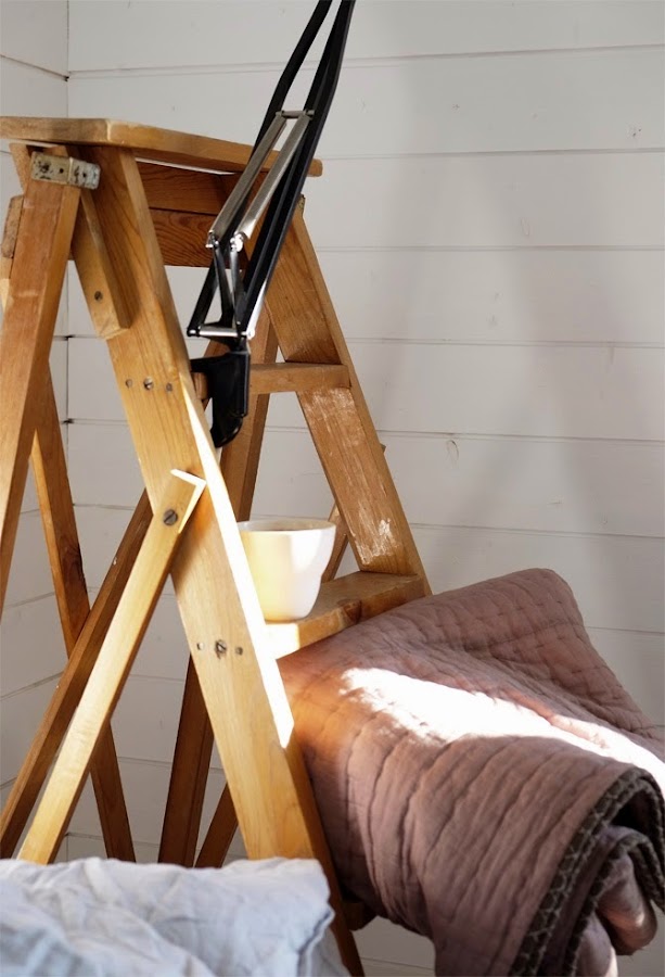 Este dormitorio es un amor a primera vista, son de esta decoraciones sencillas, naturales, originales y creativas que tanto me gustan. Textiles en tonos neutros, y detalles en tonos naturales que tanto me apasionan. En este caso la madera en tono natural la pone una escalera de peldaños transformada en una mesilla realmente preciosa. Una delicia de dormitorio digno de elogio.