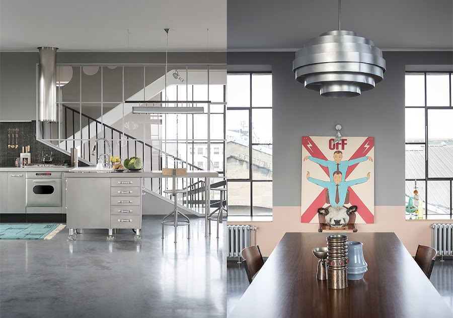 Ventanas enormes, luz, las habitaciones de tamaño inusual, los elementos estructurales de edad y los materiales desempeñan el papel principal. Puertas de hierro viejo se mantuvieron, vigas originales reutilizadas para estanterías de libros. El nivel del dormitorio en cambio fue diseñado para ser atrevido y privado ambientado en el siglo pasado.