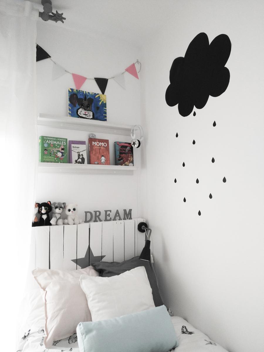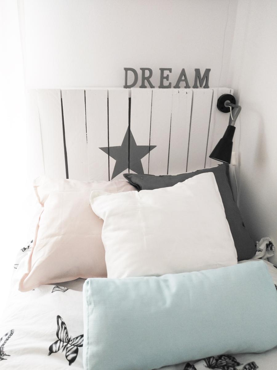 Para el cabecero usamos un palé de esos que te encuentras en cualquier contenedor y lo transformamos, pero eso ya lo explicaremos el próximo día. Encima colgamos dos estantes para cuadros KNOPPÄNG de Ikea ( 7,99 /ud. ), para colocar sus libros y hacer que la cama fuera también su rincón de lectura. También instalamos en el cabecero una lámpara de pared KVART de Ikea ( 5,99 ). La funda nórdica que escogimos es de Zara Home ( 39,99 ) y la combinamos con cuatro cojines de Ikea ( 3,99 /ud. ) en blanco, rosa, gris y azul. Y fabricamos unos banderines para la parte superior por menos de 2,00 .