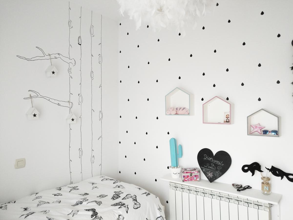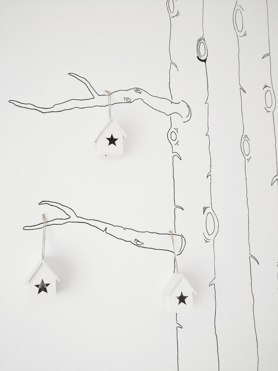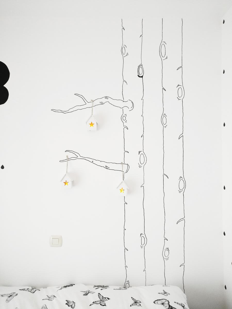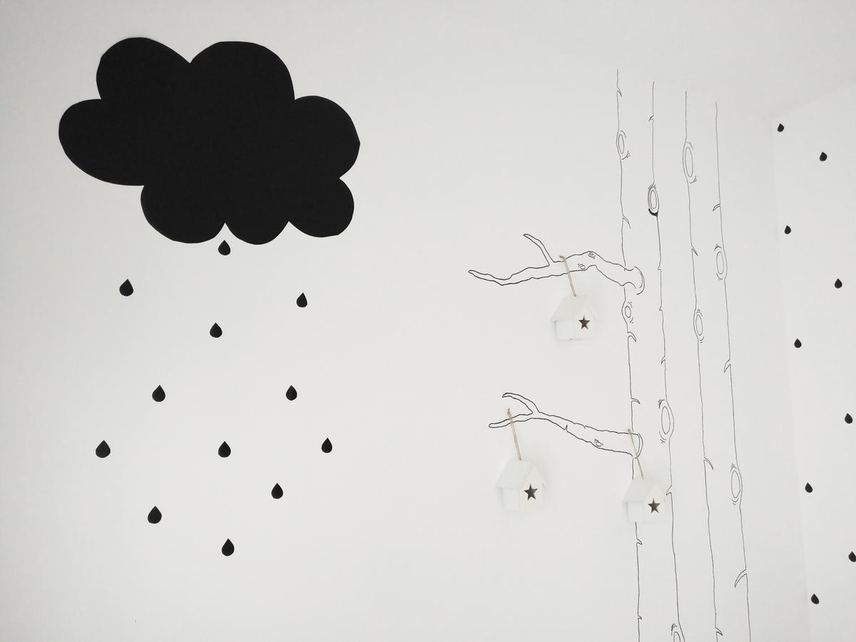 Con un vinilo de pizarra (11,95 ), dibujamos y recortamos una nube grande y muchas gotas para decorar las paredes. Después dibujamos con lápiz dos troncos de árbol (por si nos equivocamos podemos borrar con la goma) y más tarde los repasamos con un rotulador negro de punta gruesa. Por último colamos estas casitas con luz tan monas que encontramos en Muy Mucho por ( 3,95 /ud. ).