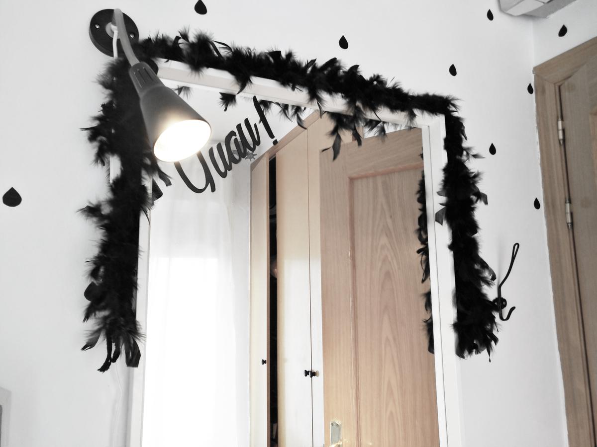 Colocamos un espejo NISSEDAL (49,99 ), al que le pegamos unas letras que previamente recortamos del mismo vinilo de pizarra y añadimos una lámpara de pared KVART de Ikea ( 5,99 ).